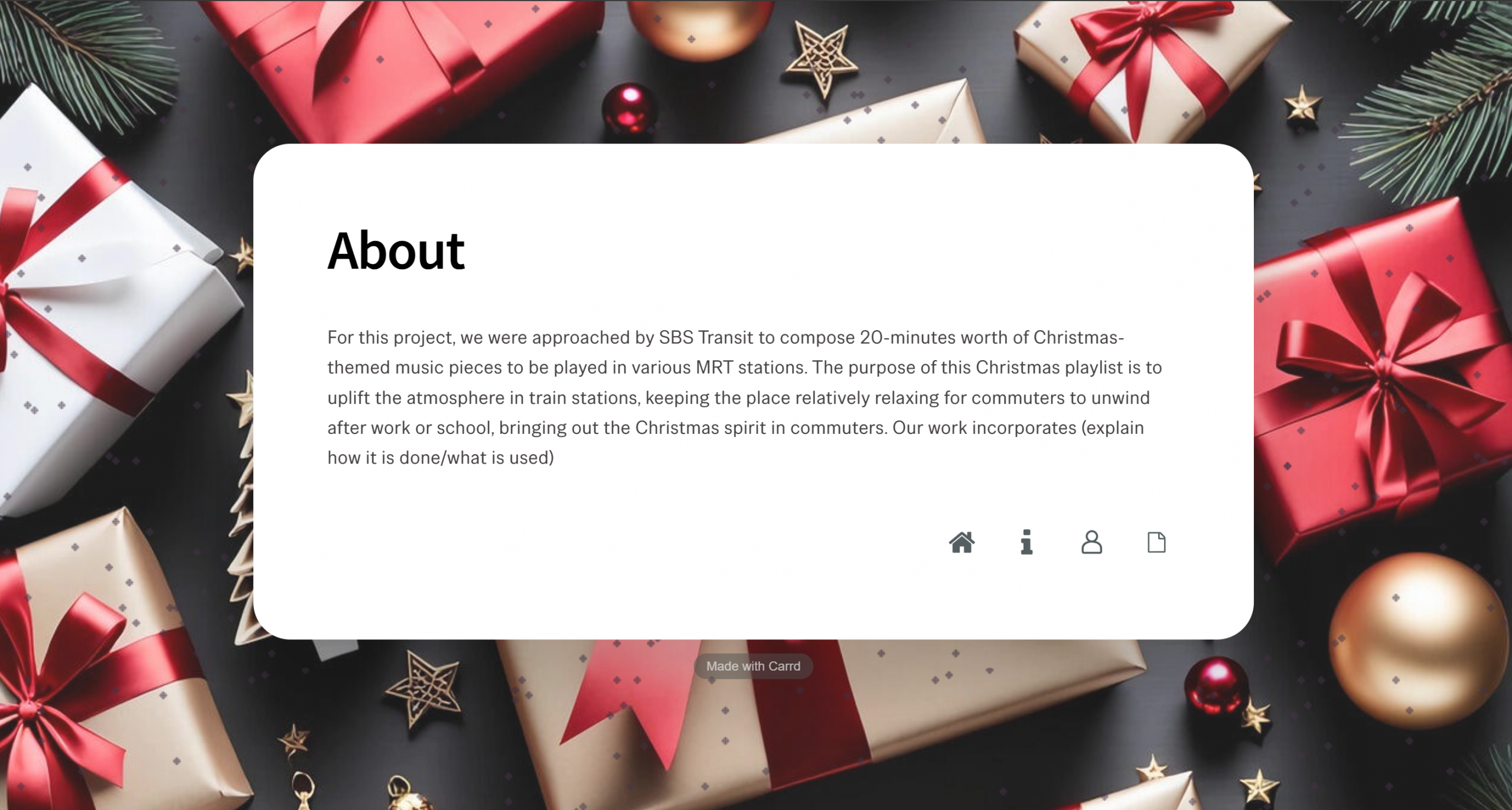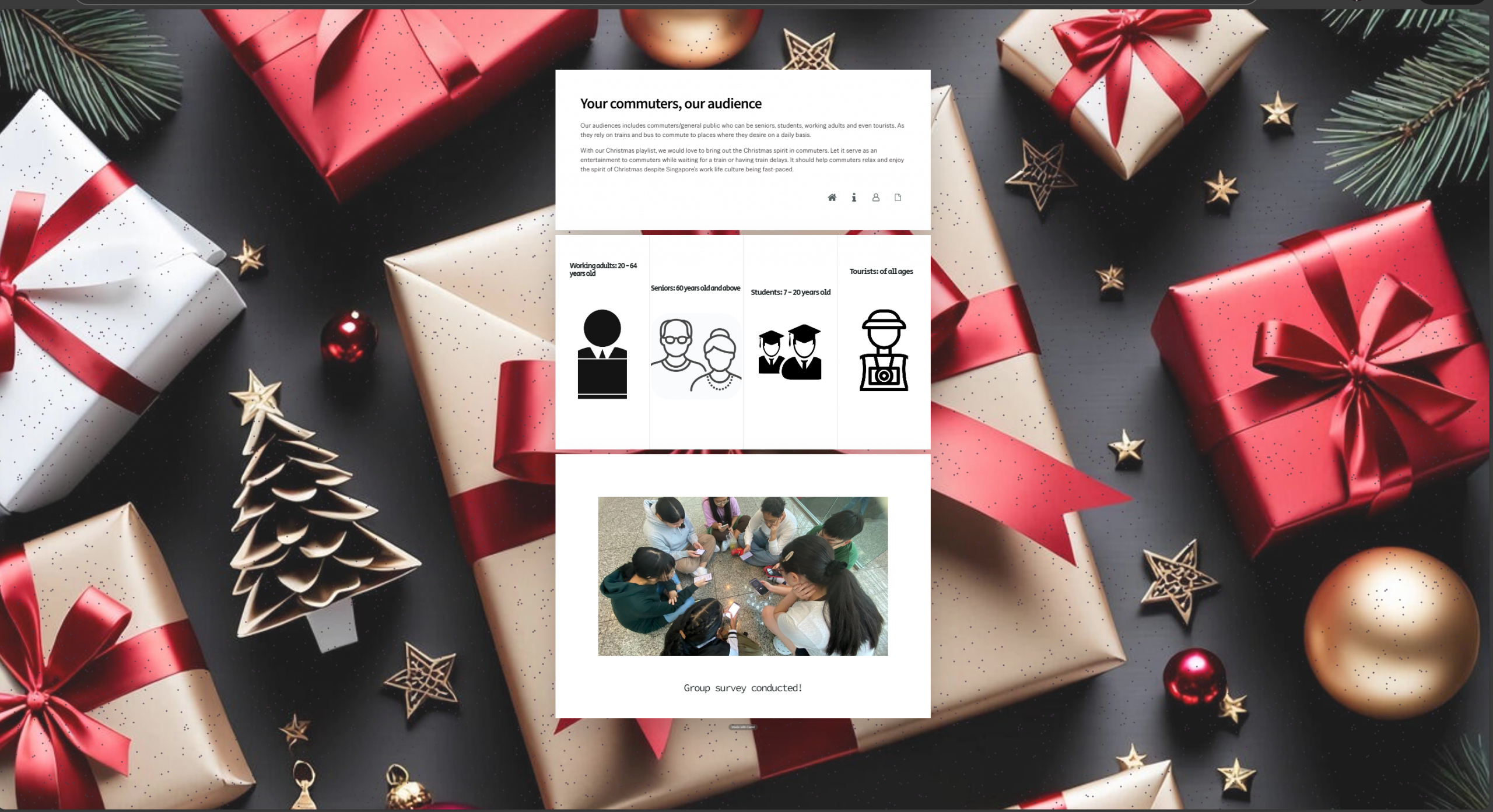Jolly commuters, Jolly Christmas is a student project (T300 FYP DSA_03 – Music Production) created in collaboration with SBS Transit. The core idea is to develop a 20-minute set of Christmas-themed music pieces that are played in various Mass Rapid Transit (MRT) stations to enhance the commuting experience. The playlist is designed to uplift the atmosphere in train stations, helping daily commuters — including working adults, students, seniors, and tourists — feel relaxed and enjoy the festive Christmas spirit even amidst Singapore’s fast-paced daily routines. Through this musical initiative, the project aims to make waiting for trains or enduring delays more pleasant and joyful for the public.
