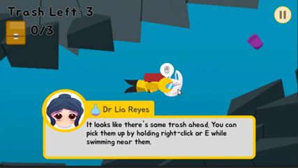 DeepSEA Cleaning is a serious game on PC in which you play as a diver cleaning up the coral reefs of Southeast Asia. The Goal is to spread awareness of ocean pollution to youths through a familiar medium and encourage them to take better care of the environment. Through playing the game youths will understand the impact pollution has on our environment and grow to understand and care for our world more.